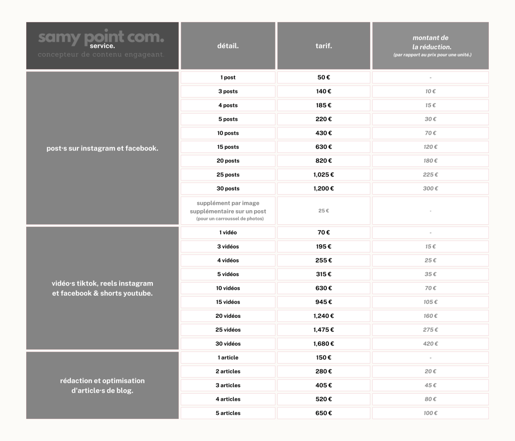 ces tarifs, ttc, sont listés à titre indicatifs. n’hésitez pas à prendre rendez-vous ci-dessous avec moi afin d’en discuter de vive-voix :